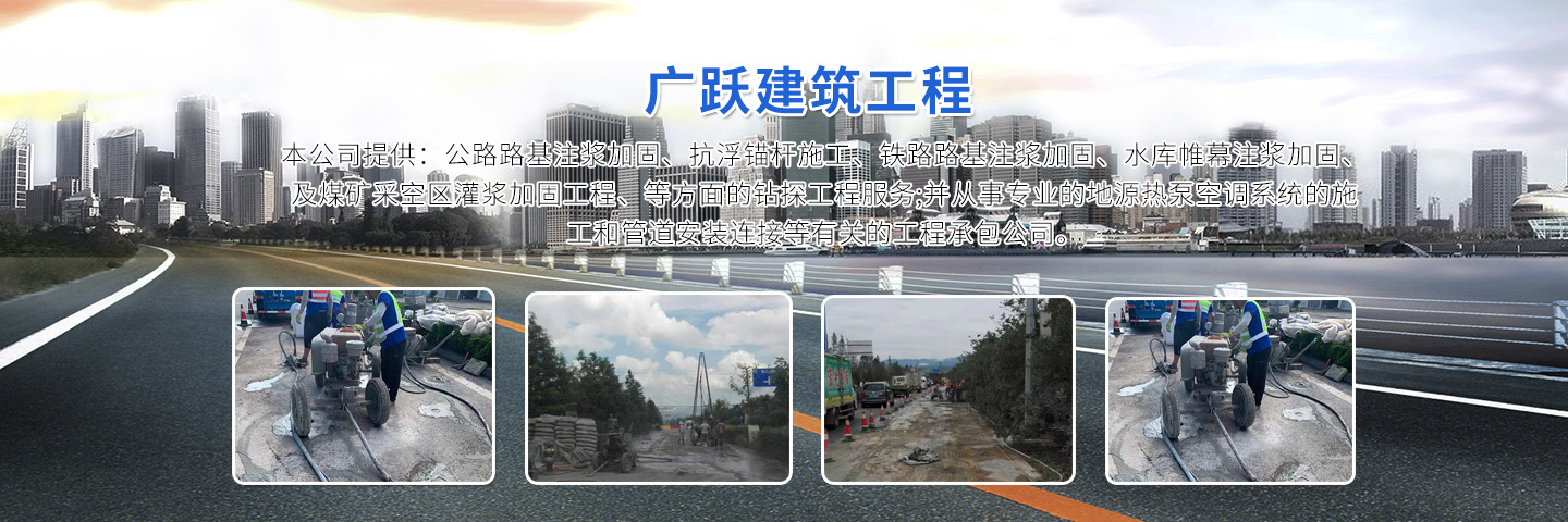 徐州廣躍建筑工程有限公司,公司成立于2010年,有專業(yè)施工人員50人,從事專業(yè)加固注漿施工。 本公司提供:公路路基注漿加固、抗浮錨桿施工、鐵路路基注漿加固、水庫(kù)帷幕注漿加固、及煤礦采空區(qū)灌漿加固工程、等方面的鉆探工程服務(wù);并從事專業(yè)的地源熱泵空調(diào)系統(tǒng)的施工和管道安裝連接等有關(guān)的工程承包公司。 公司成立以來一直專注于地質(zhì)鉆井工作,技術(shù)力量雄厚、設(shè)備先進(jìn):擁有專業(yè)的機(jī)械地質(zhì)鉆井精英隊(duì)伍;并具有GSY --150鉆機(jī)30余臺(tái)、GSY---200鉆機(jī)20余臺(tái)、專業(yè)回填封孔砂漿泵4臺(tái)等機(jī)械設(shè)備。公司稟承“優(yōu)質(zhì)的工程、優(yōu)惠的價(jià)格、優(yōu)良的售后服務(wù)”的經(jīng)營(yíng)理念,以“客戶滿意”為原則,著力打造一支高效、專業(yè)、信譽(yù)的工程服務(wù)團(tuán)隊(duì)。 具體服務(wù)項(xiàng)目:工程施工降水井、水源空調(diào)井、地源熱泵井、機(jī)鉆深井(工廠專用井)、石頭井、飲用水井、農(nóng)田井、地基降水處理、大型基坑降水、地下室、車庫(kù)以及橋梁注漿加固等業(yè)務(wù)。可用于廠生產(chǎn)用水,機(jī)械冷卻用水和生活用水,用水量可根據(jù)貴公司的需求量身訂做。